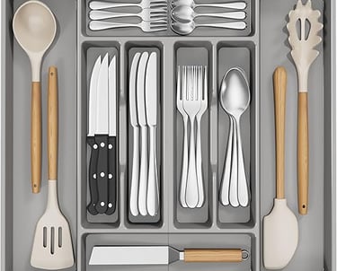 Premium Food-Grade Material: Our kitchen drawer organiser is crafted from thick and sturdy food-grade PP material, ensuring long-lasting sturdiness. It is BPA-free, keeping your cutlery and utensils safe. The smooth, glossy finish adds a touch of modern style to your kitchen