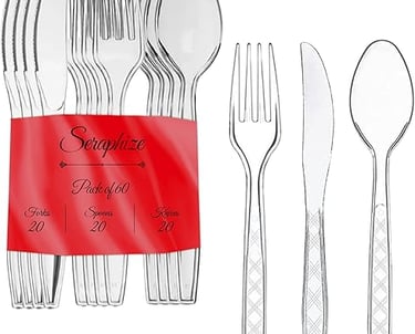 ✅Unique packing & Reusable : This plastic cutlery set reusable includes 20 spoons, 20 forks and 20 knives. Seraphize offering a unique packing 0f spoon, knives and forks that are valuable and useable according to need