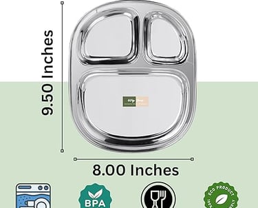 STEEL COMPARTMENT PLATES: 100 % Stainless Steel | 3 compartment plates | Thick Gauge Steel | Size : 9.5 X 8 Inches | Weight : 220 GM Each | Set of 4 Plates | 1 Inch Deep Compartments